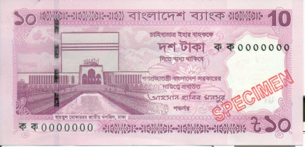 জলছাপ: আলোতে ধরলে রয়েল বেঙ্গল টাইগারের প্রতিকৃতি দেখা যাবে। এর নিচে উজ্জ্বল ইলেকট্রোটাইপে ‘১০’ এবং বাংলাদেশ ব্যাংকের মনোগ্রাম দৃশ্যমান হবে।