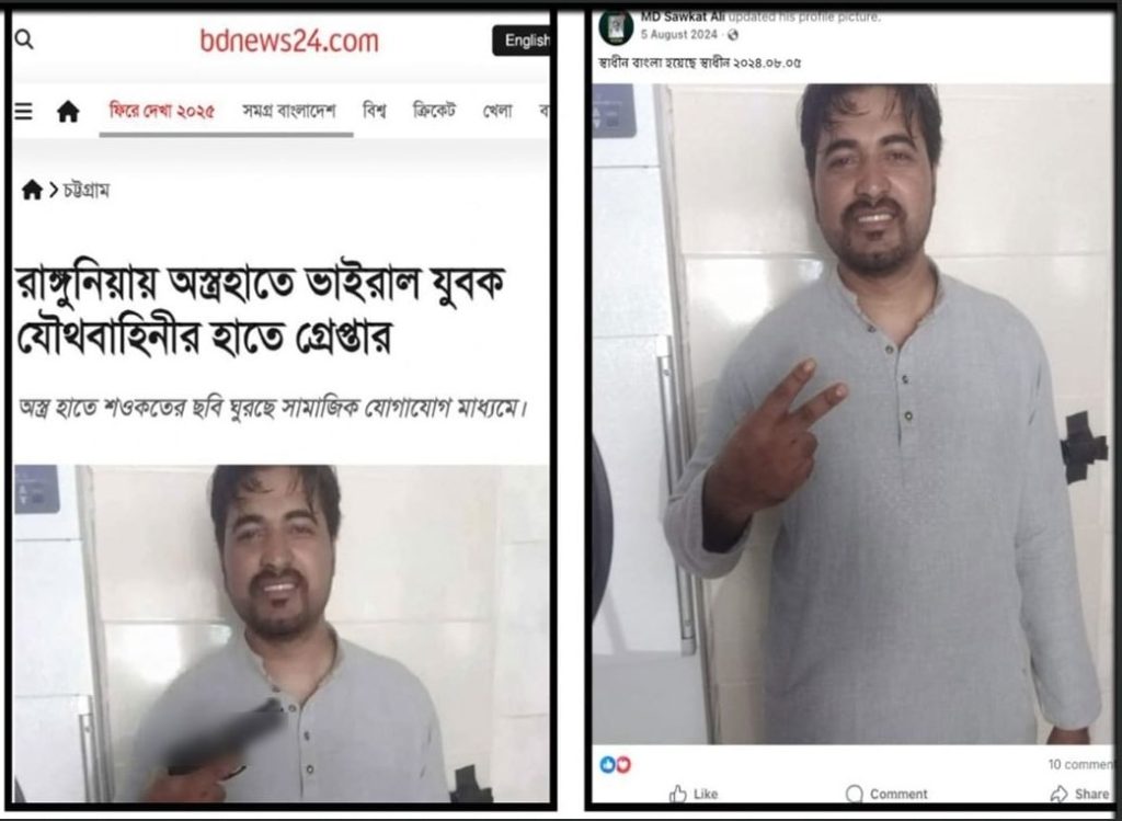 তবে দ্য ডিসেন্ট ফ্যাক্ট-চেকিং করে দেখেছে, অস্ত্র হাতে শওকত আলীর যে দুটি ছবি সামাজিক মাধ্যমে ছড়ানো হয় এবং যেগুলোর ভিত্তিতে সংবাদ প্রকাশিত হয়েছে— সেগুলো ভুয়া। প্রকৃতপক্ষে শওকত আলীর ফেসবুক প্রোফাইলে থাকা পুরনো দুটি ছবিতে ডিজিটাল এডিটিংয়ের মাধ্যমে অস্ত্র যুক্ত করা হয়েছে।